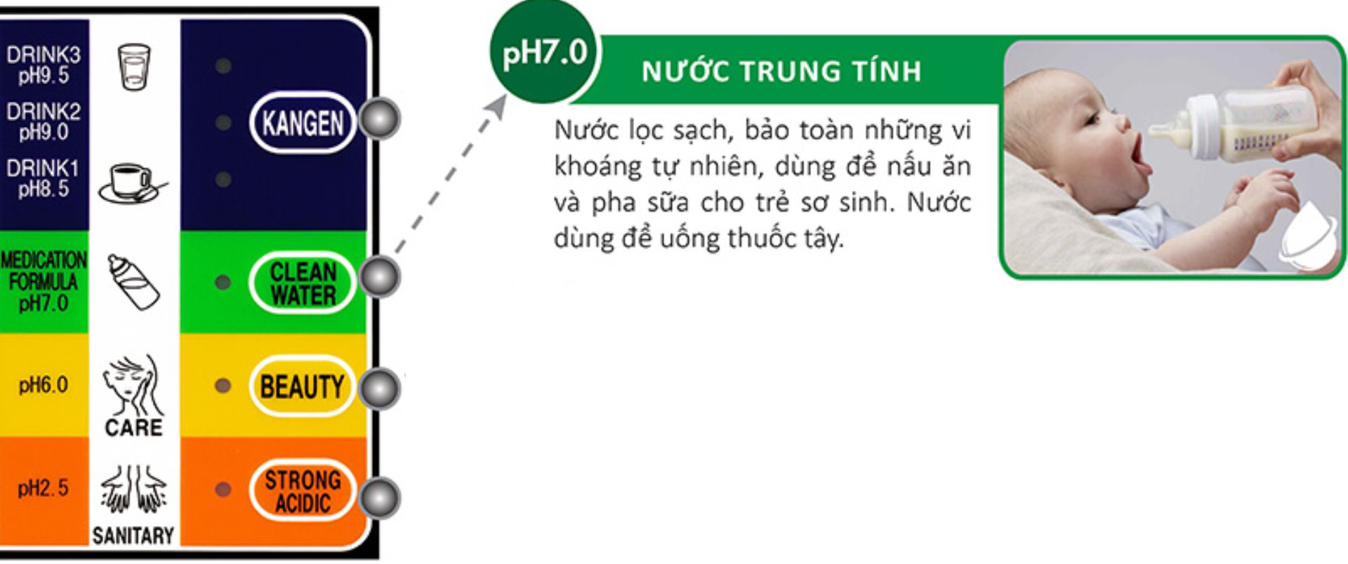 Máy Kangen có thể tạo ra nhiều loại nước với dải pH từ 2.5 – 11.5. Trong đó: Nước Kangen pH 7.0 (Neutral Water) được tạo ra từ lõi lọc tinh qua màng sợi rỗng và không qua điện phân. Đây là loại nước được khuyến nghị dùng để pha sữa cho trẻ sơ sinh, vì có độ pH trung tính, không làm thay đổi công thức sữa.