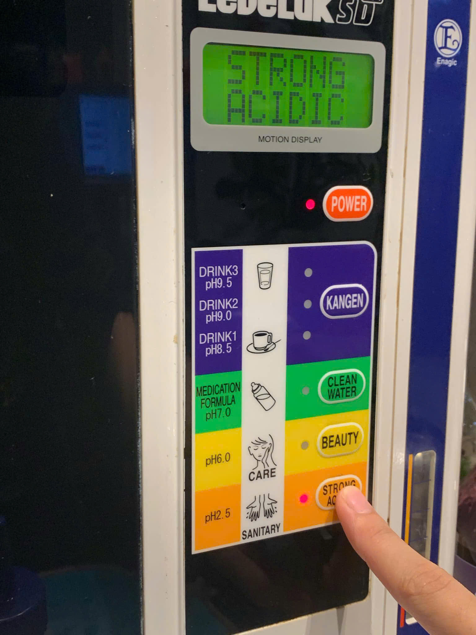 - Bật máy Kangen và chọn chế độ nước Strong Acidic Water (pH 2.5).