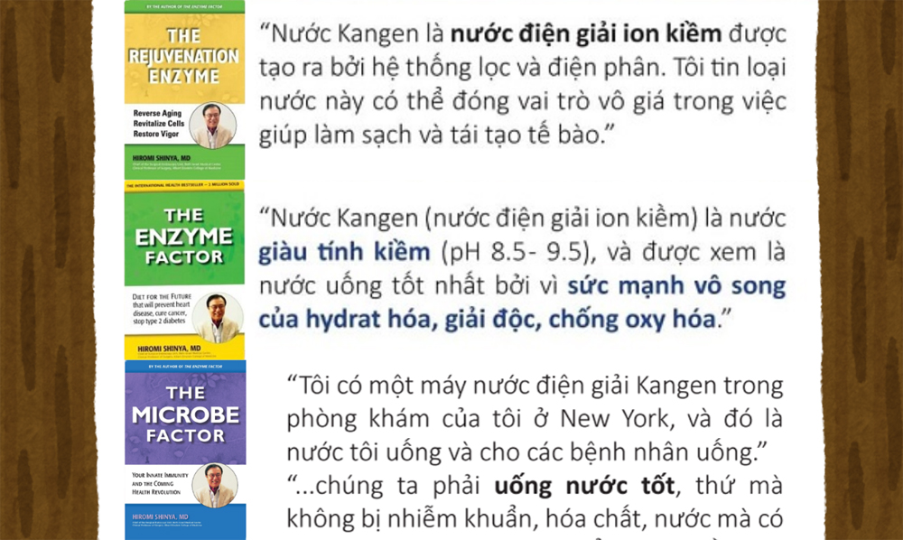 Giáo sư – Bác sĩ Hiromi Shinya, chuyên gia nội tiết hàng đầu, người từng chữa trị cho Hoàng gia Nhật Bản: “Tôi có máy nước ion kiềm tại phòng khám ở New York. Nước Kangen là nước uống tốt nhất nhờ khả năng hydrat hóa, giải độc và chống oxy hóa vượt trội.”