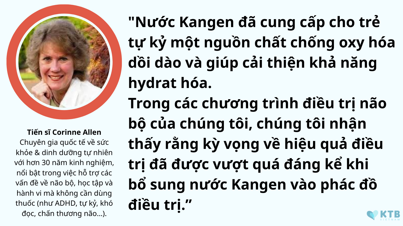 Tiến sĩ Corinne Allen, chuyên gia khoa não: Đưa nước Kangen vào phác đồ trị liệu cho trẻ tự kỷ, hiệu quả trị liệu tăng 35%.