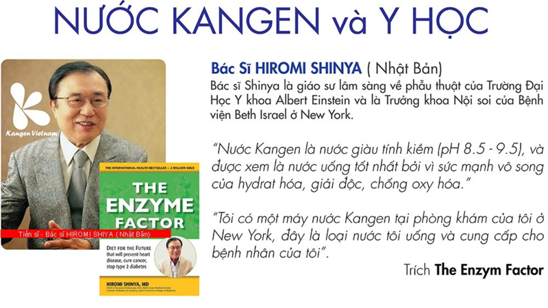 Tiến sĩ Hiromi Shinya, bác sĩ phẫu thuật nổi tiếng của Nhật Bản, người đồng phát triển nội soi dạ dày không đau, đã từng khuyến nghị nước Kangen như một phần trong chế độ ăn uống ngừa ung thư và tăng tuổi thọ.