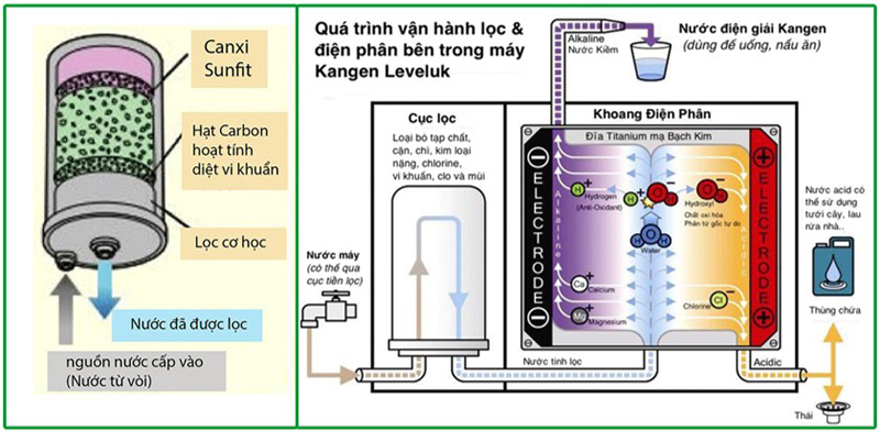 - Tại cực âm: thu được nước ion kiềm (pH > 7.0), giàu Hydro, đây chính là nước Kangen để uống.