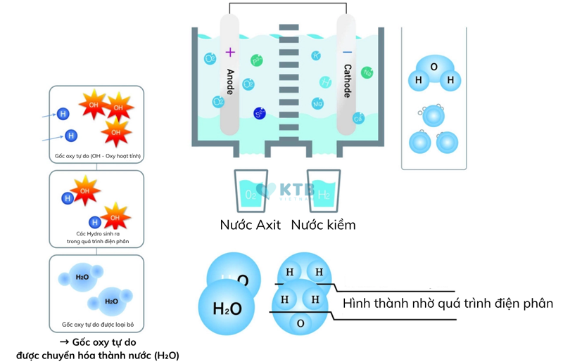 Ở nước Kangen: Quá trình điện giải giải phóng ra một lượng lớn khí Hydro (Hydrogen) hòa tan trong nước. Hydro được biết đến như một chất chống oxy hóa lý tưởng, có khả năng trung hòa các gốc tự do có hại – thủ phạm gây ra lão hóa và nhiều bệnh tật nguy hiểm.