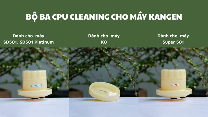 - Đối với máy Kangen K8: CPU chỉ thực hiện chức năng ngăn dung dịch vệ sinh đi vào buồng điện phân. Việc chứa dung dịch E-Cleaning được tách riêng trong Cleaning Tank – một dụng cụ chuyên dụng được tặng kèm khi mua máy Kangen K8 tại KTB.