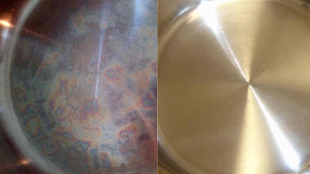Ngâm dao, thìa, chén dĩa hoặc các bề mặt inox trong nước kiềm 11.5 từ 5–10 phút, sau đó lau khô và đánh bóng bằng khăn mềm. Kết quả là inox sáng bóng, loại bỏ vết ố dầu mỡ cứng đầu.